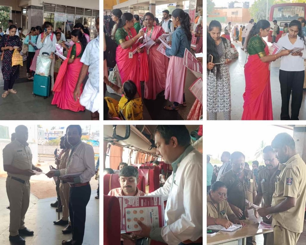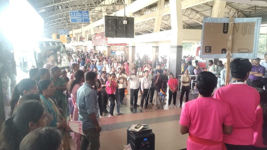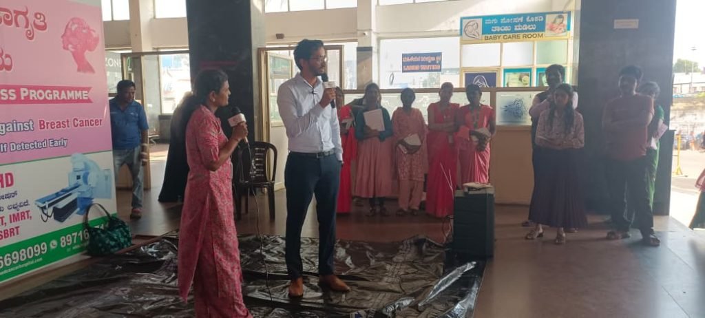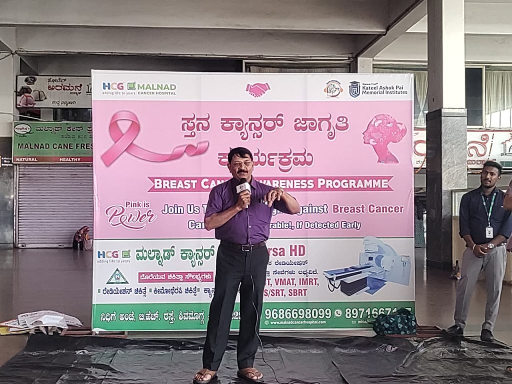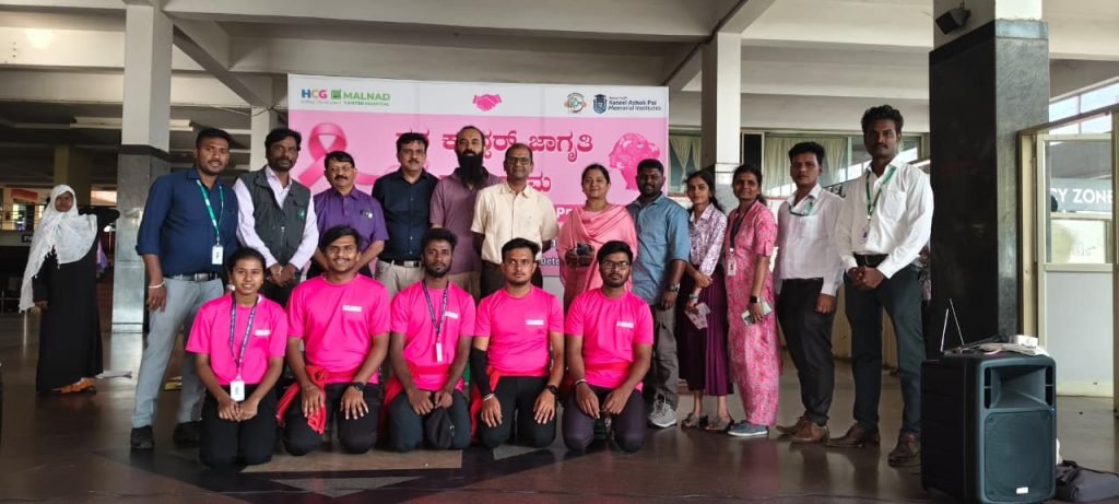 Shivamogga, October 30, 2025: Malnad Cancer Hospital, Shivamogga, organized a Breast Cancer Awareness Program at the KSRTC Central Bus Stand, Shivamogga, to educate the public about breast cancer symptoms, prevention, and early detection.