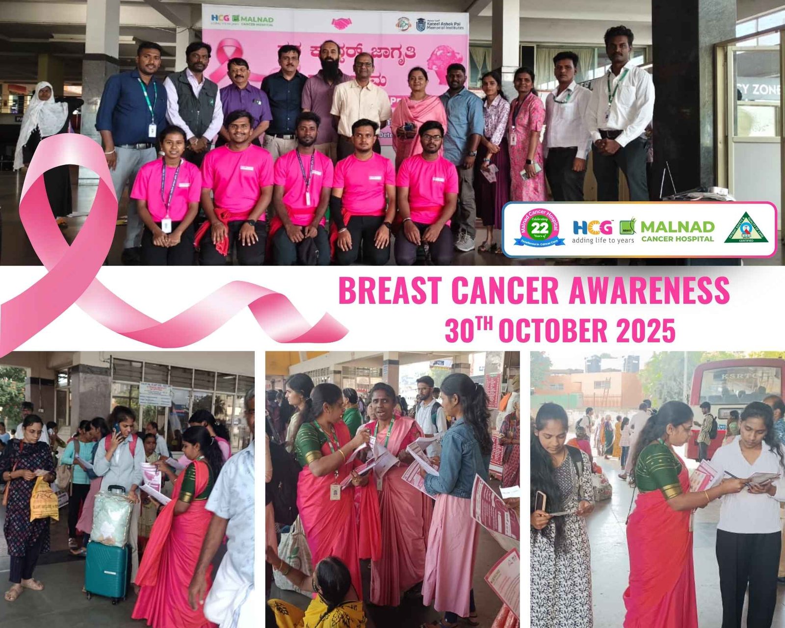 Shivamogga, October 30, 2025: Malnad Cancer Hospital, Shivamogga, organized a Breast Cancer Awareness Program at the KSRTC Central Bus Stand, Shivamogga, to educate the public about breast cancer symptoms, prevention, and early detection.